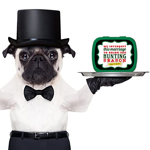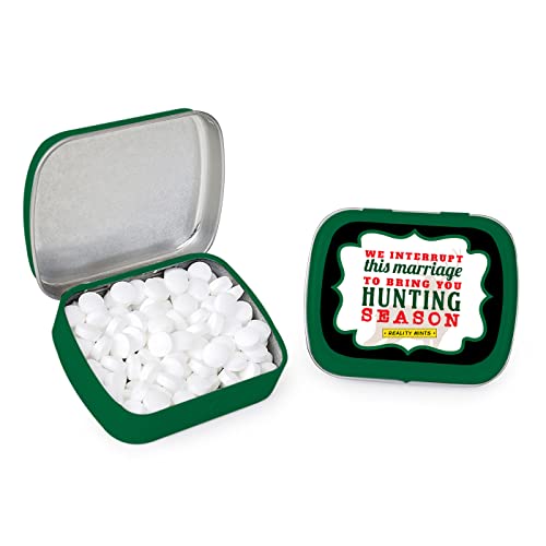 A tin of We Interrupt this Marriage to Bring You Hunting Season mints is a hilarious gift for friends and family who are known for pausing their marriage during hunting season. Filled with peppermint breath mints, this witty gag gift for men and women makes a silly stocking stuffer or addition to Easter baskets, birthday gift bags, care packages, or Valentine’s Gifts for anyone on your gift list. They’re also a go-to choice for White Elephant parties or Secret Santa gift exchanges.