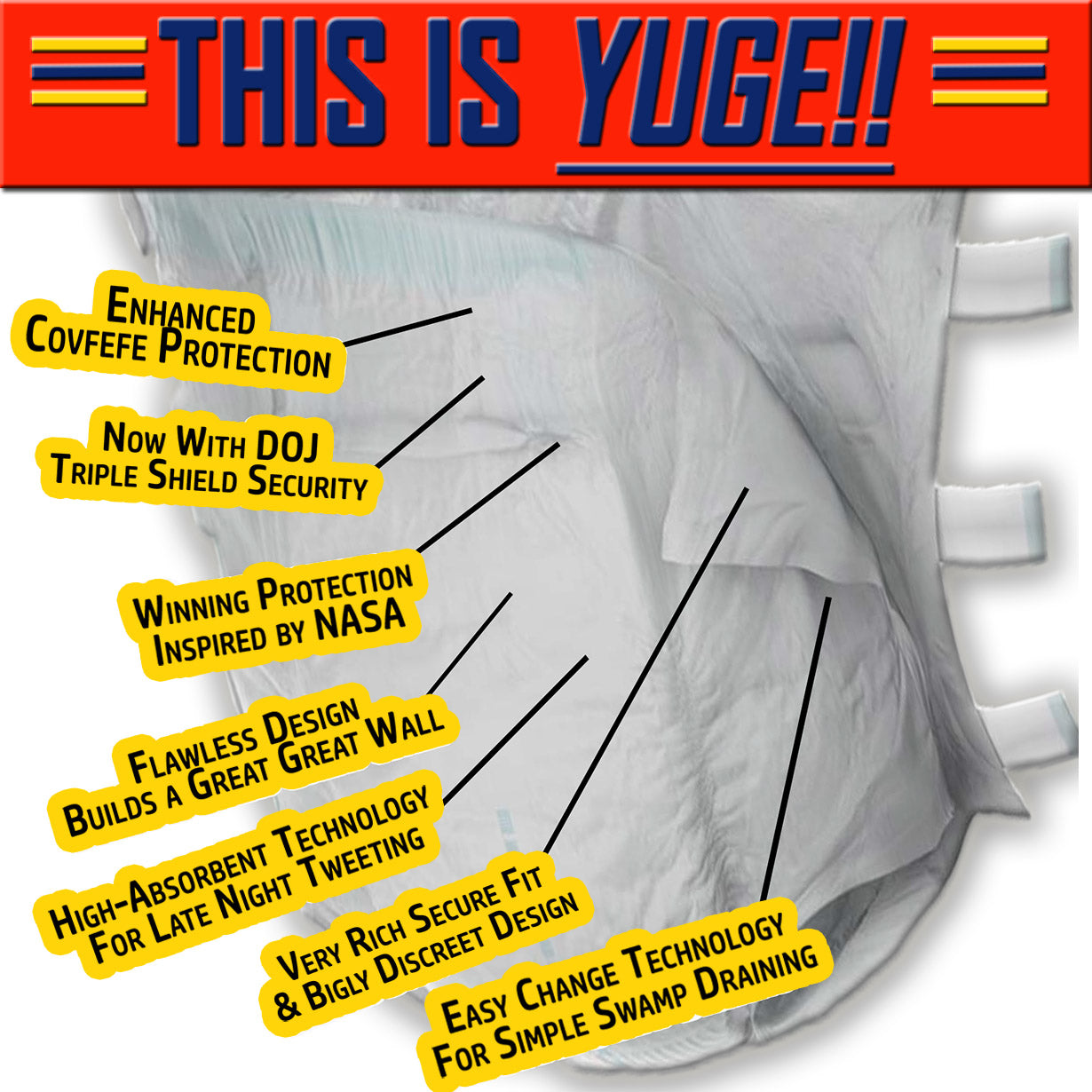Surprise all your friends with The Donald’s Top Secret Leak Protecting Adult Diapers. This funny Trump gag gift will have them rolling in the aisles, and possibly leaking in their shorts. Bigly fun had by everyone. This is YUGE!