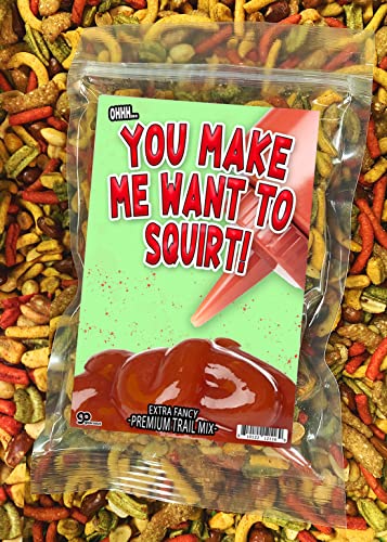 If you are tired and hungry no big deal with this funny ketchup lovers gag gift. Who doesn't want to squirt when it comes to ketchup? This makes a great gift for your ketchup obsessed uncle or brother. If you are looking for a funny gift alternative to a boring coffee mug with funny sayings give Uncle Franks trail mix a try today! Give the gift of laughter, which is the greatest gift of all time. This unique blend of flavor is an ideal odd gifts for white elephant parties or gag gifts for men and women who are celebrating milestone birthdays and retirements. Snack time becomes a celebration and a party table immediately looks more festive when You Make Me Want to Squirt guacamole sesame mix is part of the plan. If you like medium hot snacks, give this mixture a try. Slightly crunchy sesame sticks and light, crispy guacamole strips don’t escape the sprinkling of spices that adds excitement, intensity and heat to this mixture that’s sure to provide a jolt to your taste buds. If you are looking for a funny gift alternative to a boring coffee mug with funny sayings give Uncle Franks trail mix a try today! Packaged perfectly for gifting to men and women in stockings, food gift baskets, and Christmas care package gifts. Each package of our fine snacking gift comes in a resealable gift pouch for easy snacking while on the go. If your searching for funny gifts for men who happen to love ketchup. Of course this trail mix goes best with a side of ketchup.