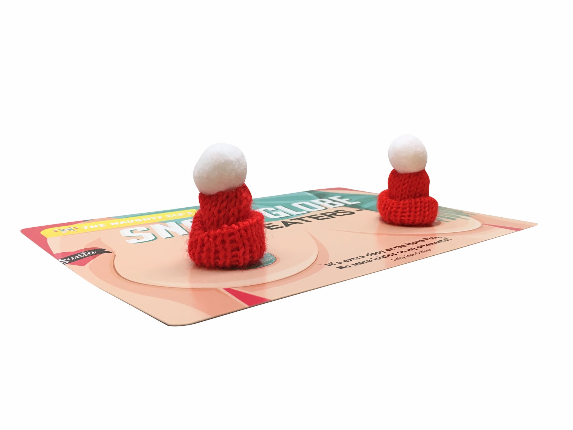 - Festive, red, knit Santa hats for hooters, complete with a fun white fluff ball for holiday flair